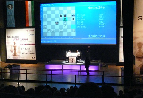 A beautiful game by Vishy Anand last night. He crushed Vladimir Kramnik in 41 moves. Anand also had he black pieces which makes the game even more unbelievable! 4000 People watched the game live last night. While watching, they discussed possible moves. Some were using Fritz while other used Rybka. Anyways, here is the game.