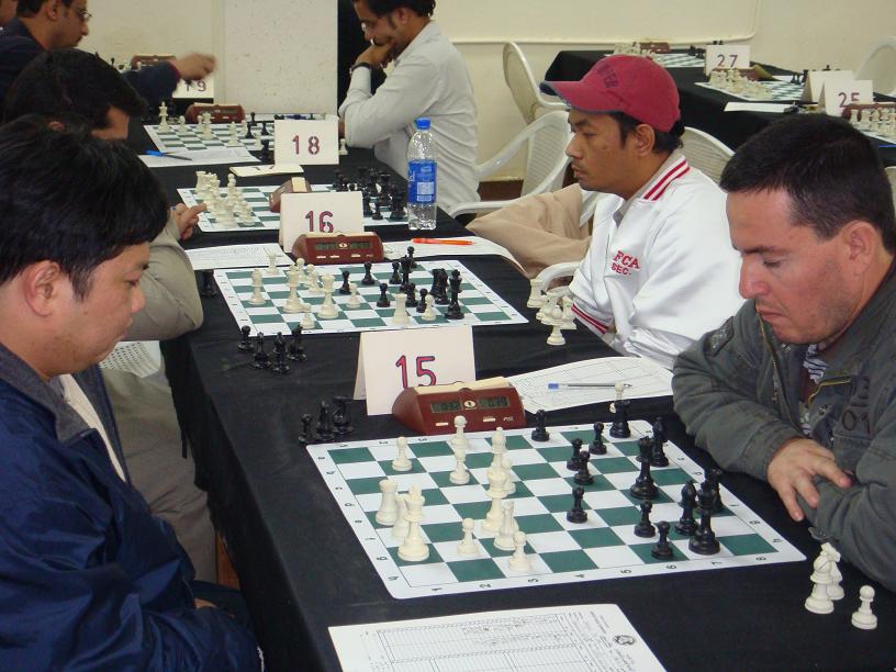 Here’s a quick report. One of the surprising favorites lost in Round 3. Bader Al Hajeri lost to Dennis Poliquit in a long battle that lasted 42 moves. After Dennis made his 42nd move, Bader was forced to resign. He was down too much material to continue.  Here is part of the game: 1. e4 e5 2. Nf3 Nc6 3. Bb5 a6 4. Ba4 Nf6 5. 0-0 Nxe4 6. d4 b5 7. Bb3 d5 8. dxe Be6 9. Nbd2 Nc5 10. c3 Nd3 11. Qe2 Nc1 12. Rac1 Na4 13. Bc2 c5 14. a4 Qd7 15. Ng5 c4 16. f4 g6 17. f5 gxf 18. Bf5 Bf5 19. … SCORE SHEET UNCLEAR…