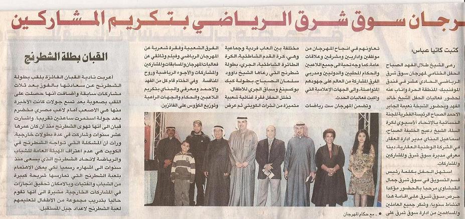 In this post, you will see two newspaper articles that were printed a couple of weeks ago. One talks about the Sharg Tournament Celebrations, which has our own Nadia Al Qabban accepting a prize from Shiekha Naema Al Sabah. Congratulations to the Strongest Kuwaiti Female Chess Player. We are all proud of you!
